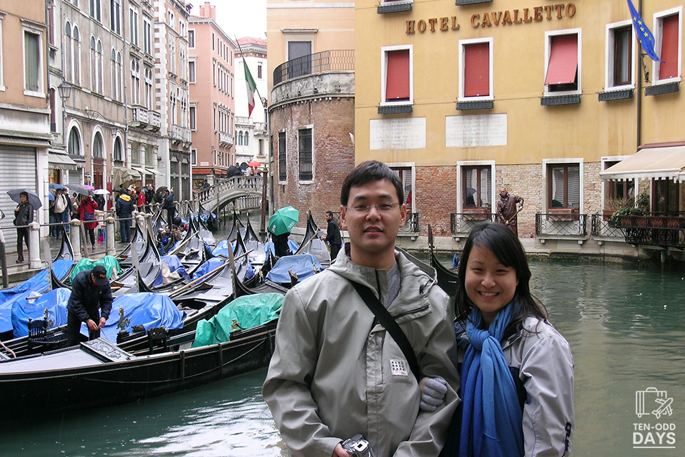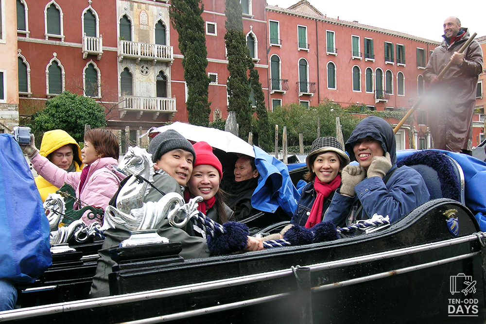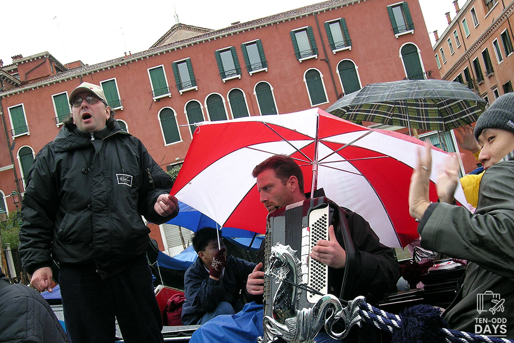 Despite the downpour, several of us agreed upon renting two gondole (Italian: singular – gondola, plural – gondole), complete with two musicians, for a ride along the Grand Canal. We must have been quite a sight, huddling close together and carrying umbrellas on the gondole rides. It was a once-in-a-lifetime experience which did not come cheap. Rental for a gondola generally costs about 100€ for a 1-hour ride, and does not come with musicians at that price. Such a ride can be a rather delightful experience for first-time visitors to Venice, but only if you could somehow forget the price and ignore the stench at some parts of the canal. Remember – concentrate on the novelty of the experience and you’ll be fine!