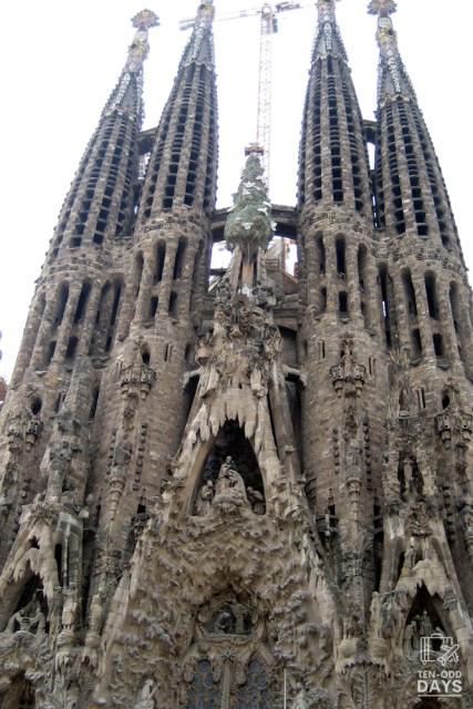 There are 3 grand facades to the church building – the Nativity facade to the east, the Passion facade to the west, and the Glory facade to the south. The Nativity facade was the first to be completed and directly bore most of Gaudí’s influence. At the time of our visit, only the Nativity facade was truly complete; both the Passion and Glory facades were still undergoing construction, especially the latter. Without a wide-angle lens, there was just no way one could take in the whole facade of the cathedral, which stood at an astounding height including the spires.