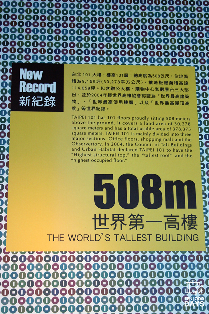It was a cloudy day. and with the sun hidden, we were feeling the chills. We brisk walked quickly to our next destination, Taipei 101 (台北101) where we could take refuge indoors. Completed in 2003, Taipei 101 building stands at 508m and comprises 101 storeys (thereby the name) and 5 storeys of basement. And between 2004 and 2010, it was lauded as the tallest building in the world, only to be surpassed by Burj Khalifa in 2010. Not that I think that this superfluous title means anything, to be honest. The title won’t stick anyway; there is bound to be another tallest building being constructed elsewhere. Makes me kinda wonder by the time I die, what’s the height of the tallest building in the world.