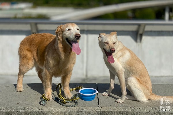 It wasn’t long before the girls stopped wanting to explore the area anyway. Without any shade in sight, Belle and Cassie went in search of their water bowl often.